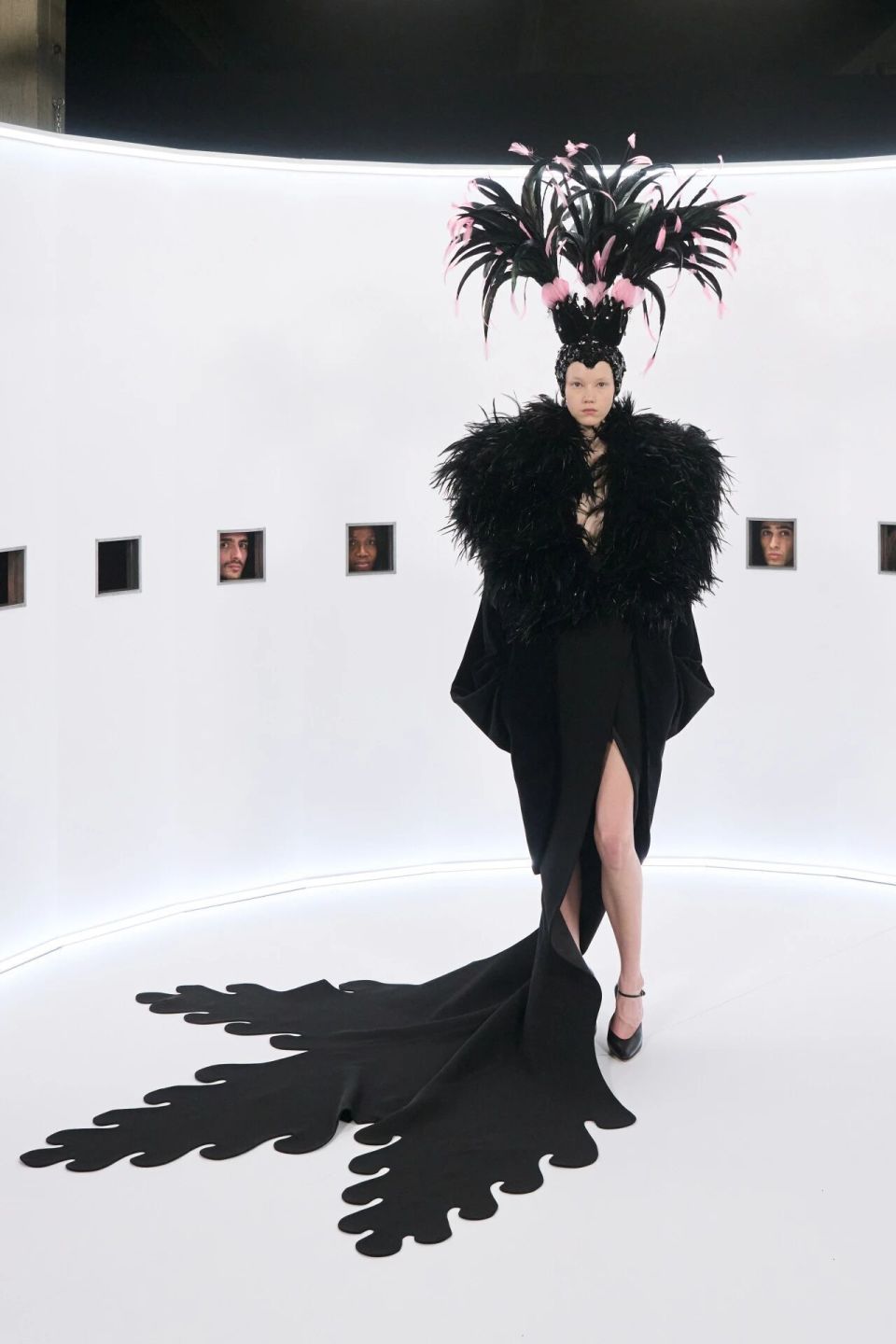 Michele将Valentino高级定制作品置于巨大的「凯撒全景装置」中,供看秀者通过方孔观看。一方面,他想让高级定制在这个高速运转的时代获得一种缓慢的观看方式,就像凯撒全景装置之于电影放映机的那种「缓慢」;另一方面,他希望Valentino的美能够如电影胶片上的女明星一样,拥有不灭的灵魂,或者说让他的作品在观众凝视中,如那些荧幕女神在电影中一样「圣显」。