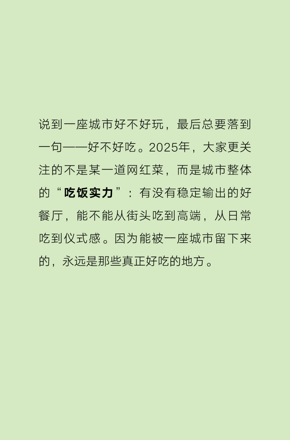 “这座城好不好玩?”“先不说景点,先告诉我好不好吃。” 这届年轻人早就不被 “网红店打卡” 忽悠了 ——2025 年拼的是城市 “综合吃饭实力”:早餐摊能不能从 6 点卖到 10 点?街头小吃到高端餐厅能不能无缝衔接?从周一到周日,能不能每天吃不同的还不踩雷?
