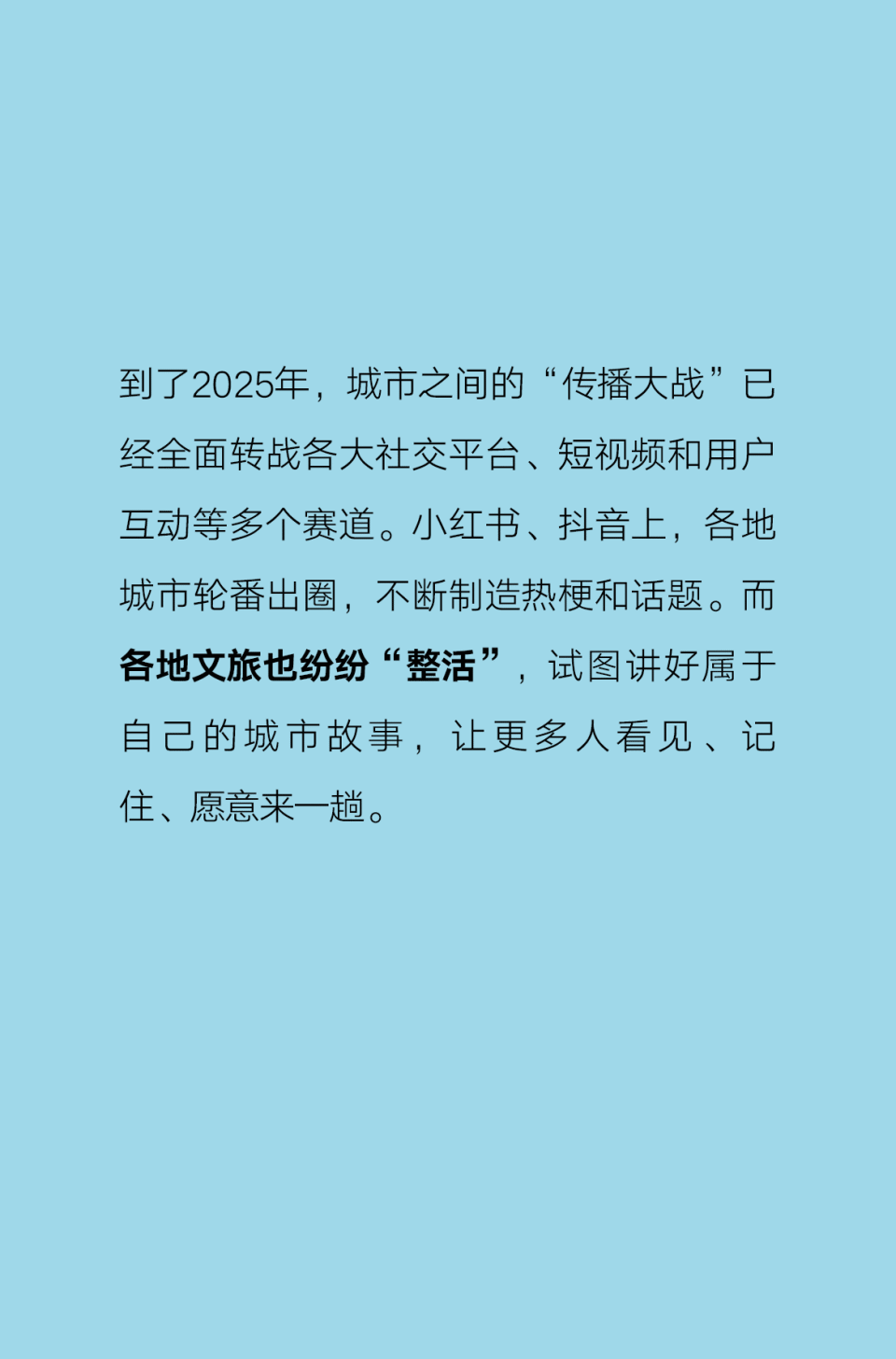 与此同时,2025年,城市之间的“形象传播战”已全面转移到社交平台。各地文旅局官方账号纷纷“下场整活”,用短剧、rap、挑战赛等形式,抢着讲好自己的城市故事。
