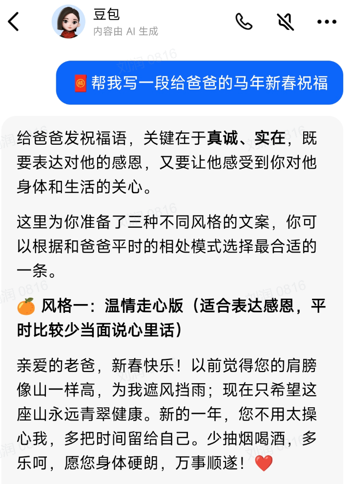 除夕当晚,“豆包红包”帮助用户生成超过5000万张新春主题头像、生成超过1亿条新春祝福。AI互动总数达19亿。