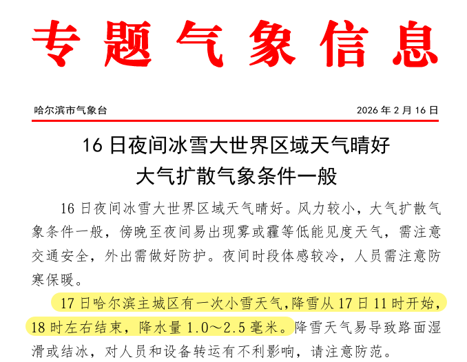 2月16日,哈尔滨市气象台发布专题气象信息产品(部分)。