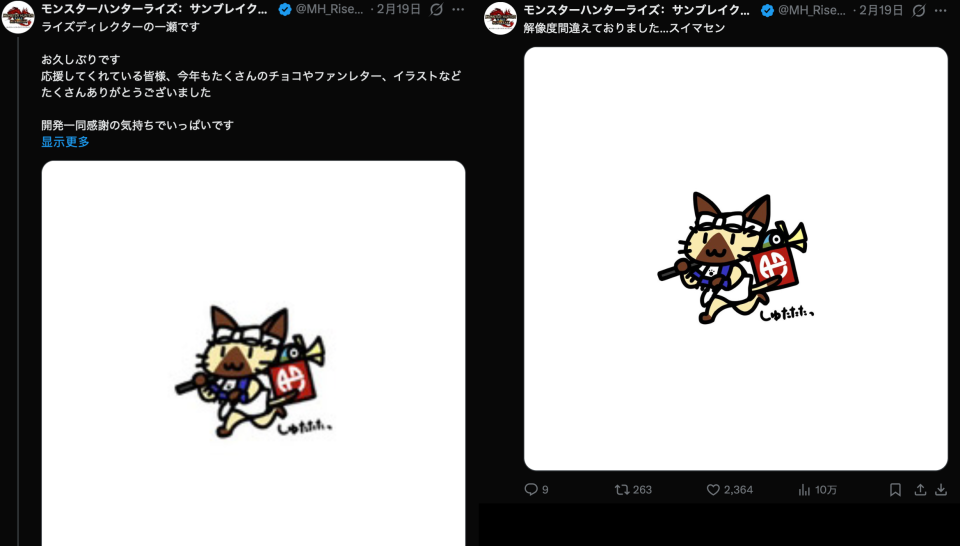 《怪物猎人 崛起》的总监一濑昨日上号发文,感谢了玩家们的支持。然而在贴文配图上,最初发布了一张很糊的版本,随后又更新了一张高清版,不免让玩家们猜测是不是在暗示《崛起》的NS2E升级补丁要来了。
