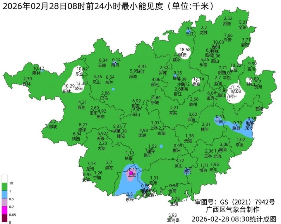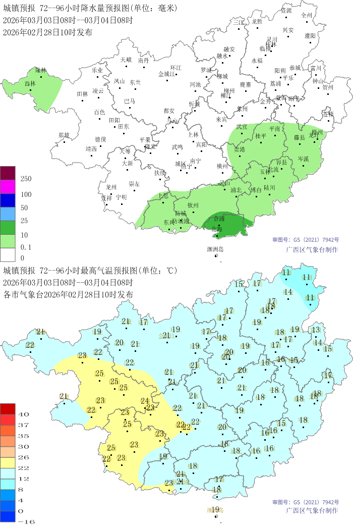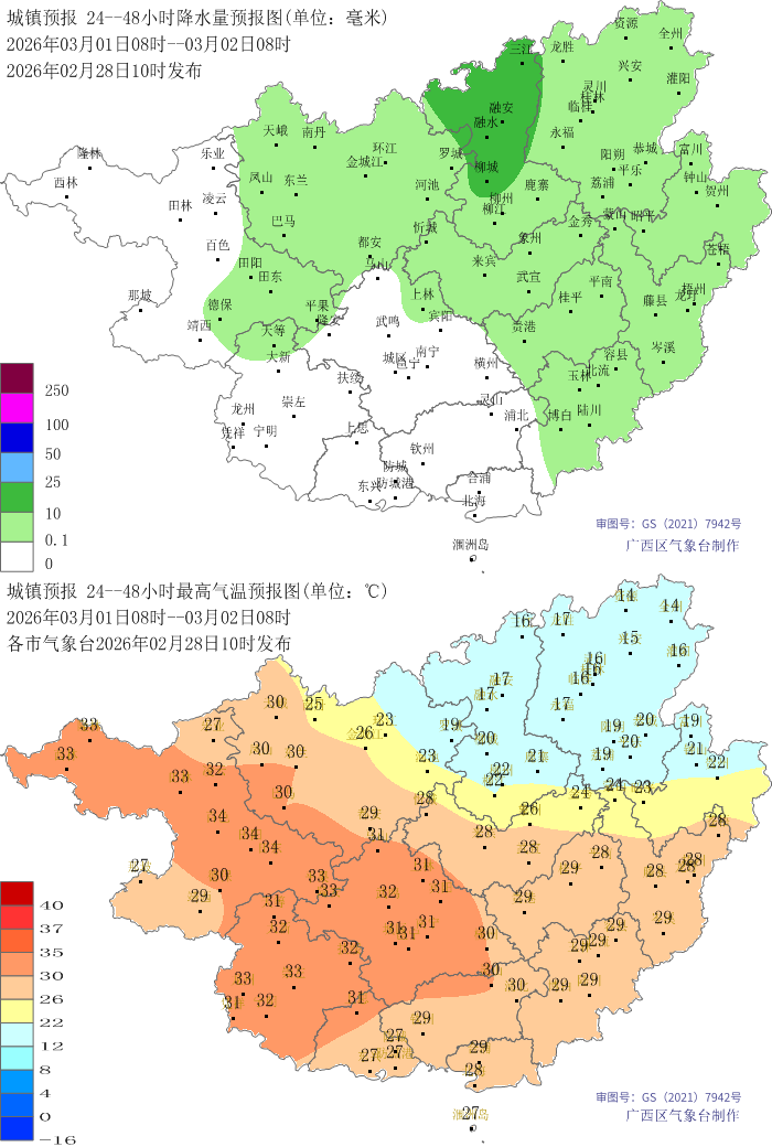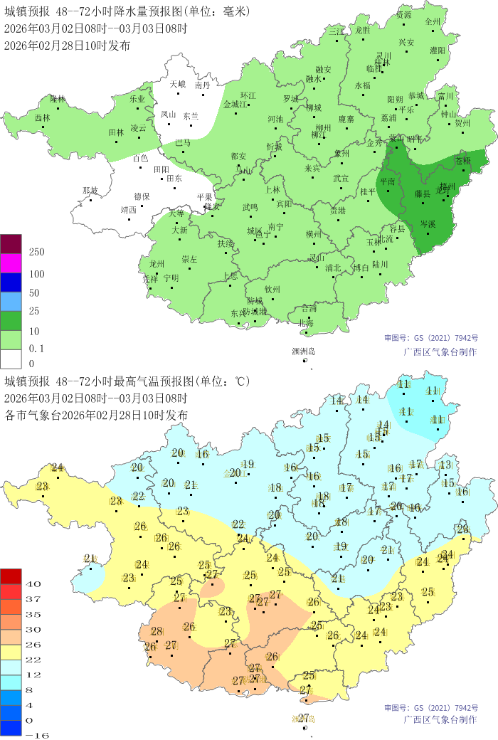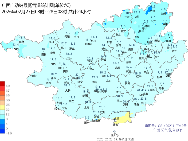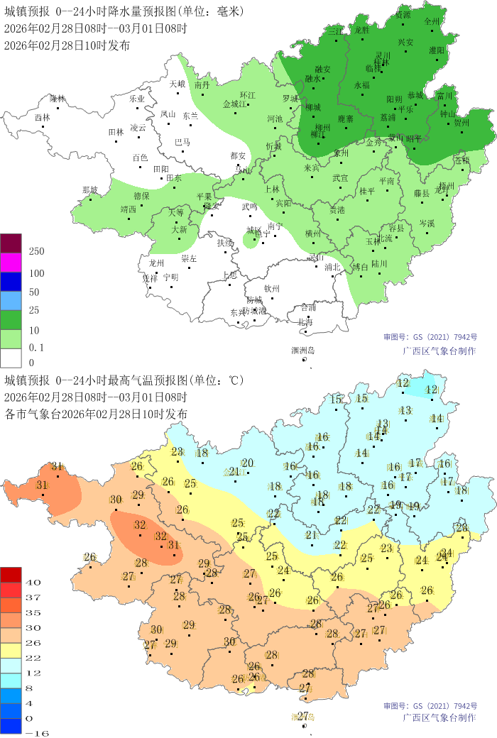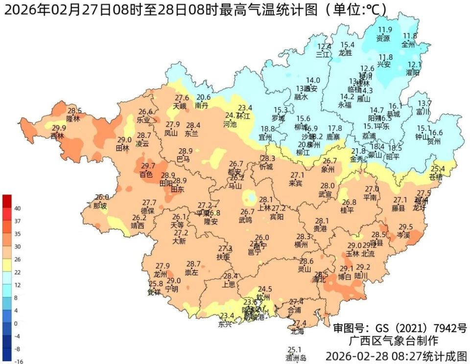 2月28日最高气温:桂东北11~19℃,其余大部20~29℃,百色西林气温最高(29.9℃);最低气温:桂东北部分地区9~12℃,其它大部地区13~20℃、局地22℃,桂林资源气温最低(9.2℃)。