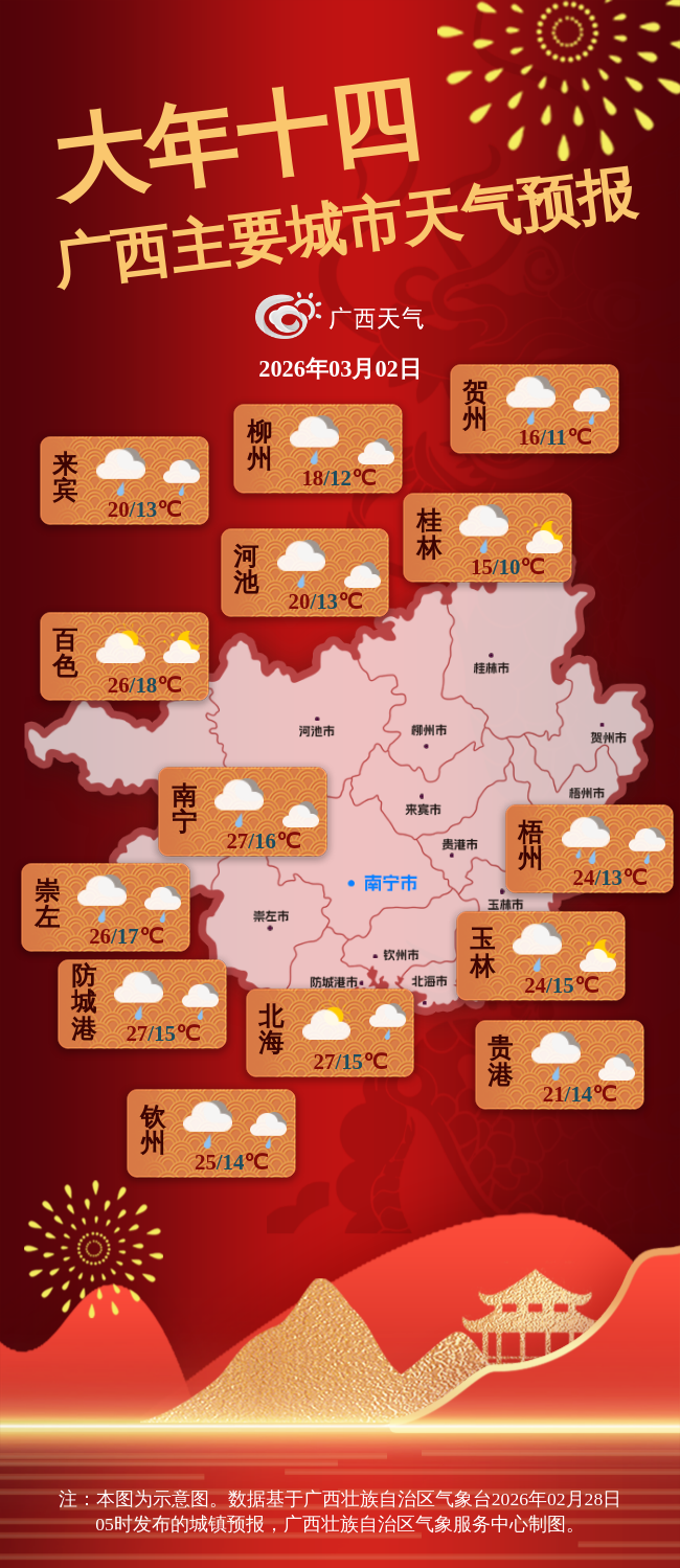 3月2日晚上到3日白天,桂南部分地区有小到中雨、局地大雨,其它地区多云到阴天有分散小雨。桂东部分地区和沿海有5级、阵风6~7级的偏北风。
