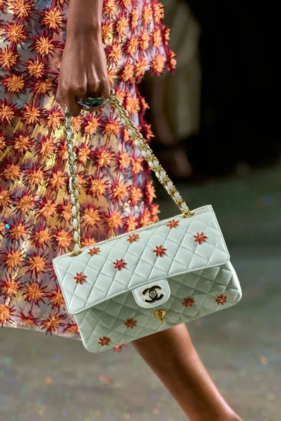 这场设计中现实与虚构的对话贯穿始终,在配饰部分达到了高潮。珠宝如同印象派画作中的色彩斑斓,珐琅与树脂珠宝上的光泽流转,蛋白石般的光彩与手绘的天然珍珠母贝工艺相互辉映。手袋设计灵感多样,不仅有经典的麂皮口盖包,还包括以嘉柏丽尔·香奈儿私人寓所沙发为灵感设计的“菱格纹沙发”款包袋。从最简洁的锁扣包,到奢华的石榴造型硬式晚宴包,双色鞋依旧抢眼,均散发着诱人而夺目的光辉。