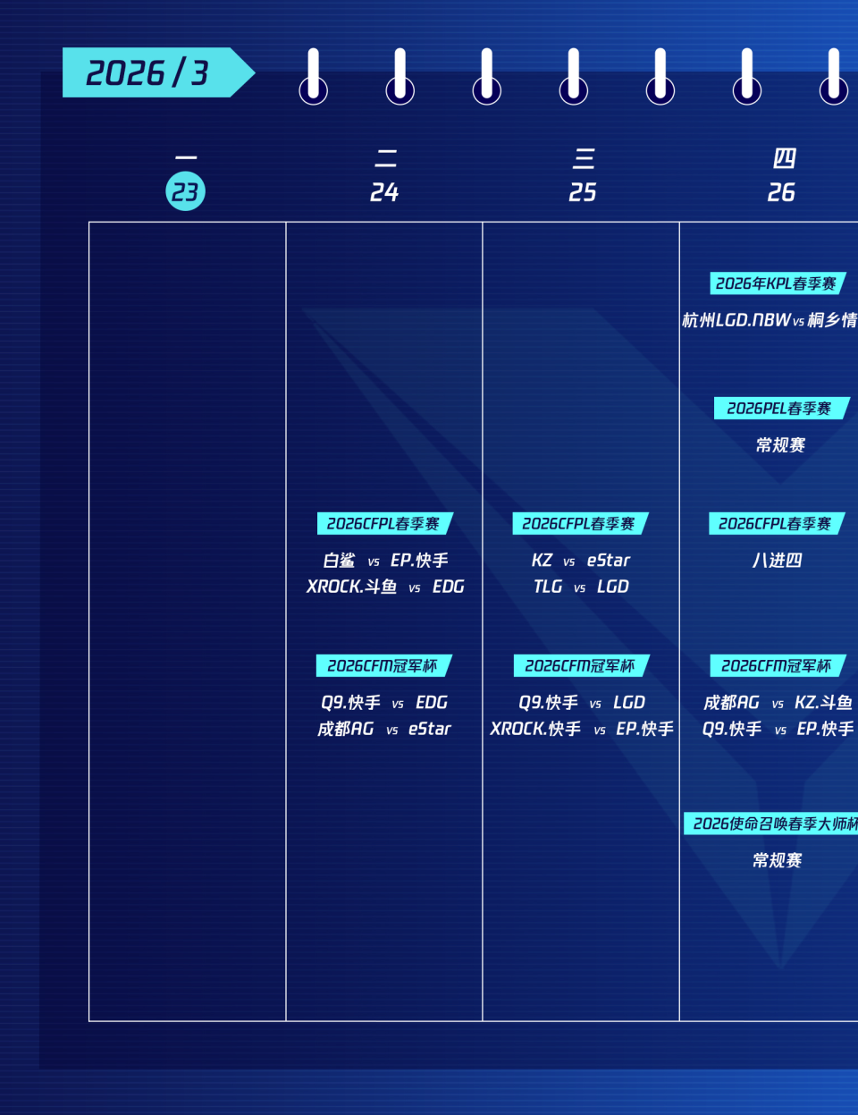 3月22日,2026年KPL春季赛常规赛结束,北京JDG、重庆狼队、KSG、成都AG超玩会、北京WB、深圳DYG、杭州LGD.NBW、南通Hero久竞、广州TTG、桐乡情久十支战队晋级季后赛,向最终的冠军发起挑战,比赛将于3月26日开启。