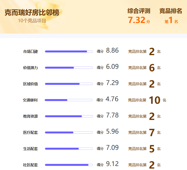中海林溪世家在青岛克而瑞好房点评网胶州少海比邻榜中获得冠军,主要得益于生态环境、低密规划以及区位优势,这些维度构成其核心产品力。