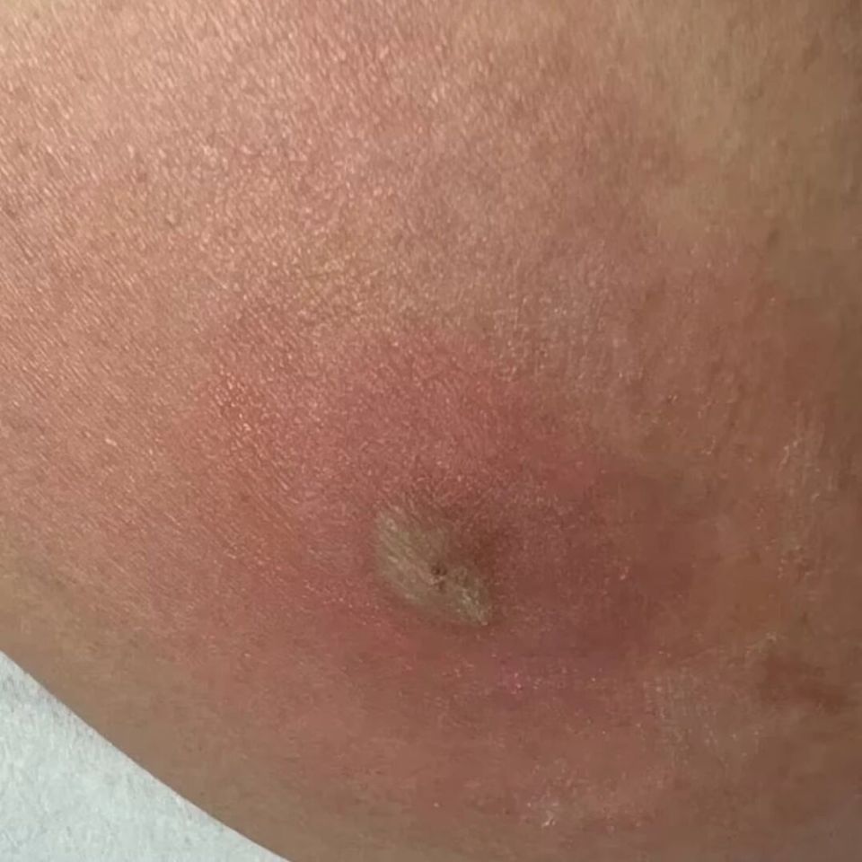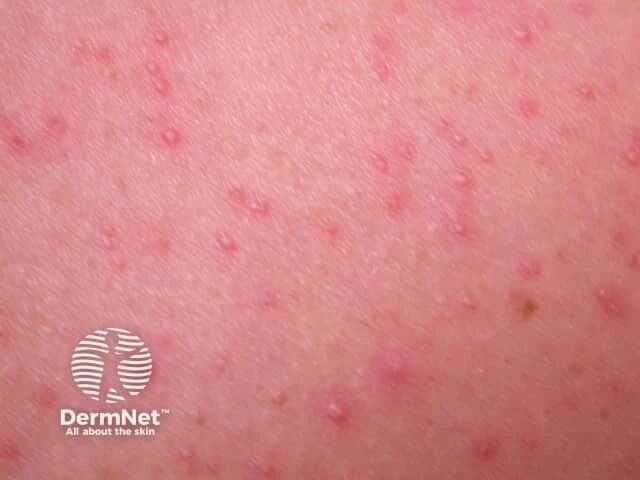 莫名其妙地冒出许多米粒大小的红疹,顶端通常有白色脓疱改变,基本上不痛,偶尔有点瘙痒。