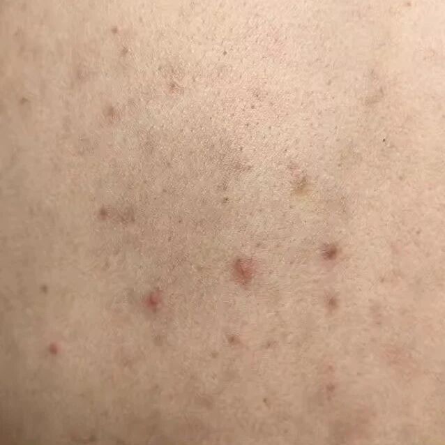 通常出现在胸部、背部、肩部,都是单一形态的毛囊丘疹或脓疱(见下图),可以有轻度瘙痒,通常没有明显疼痛。