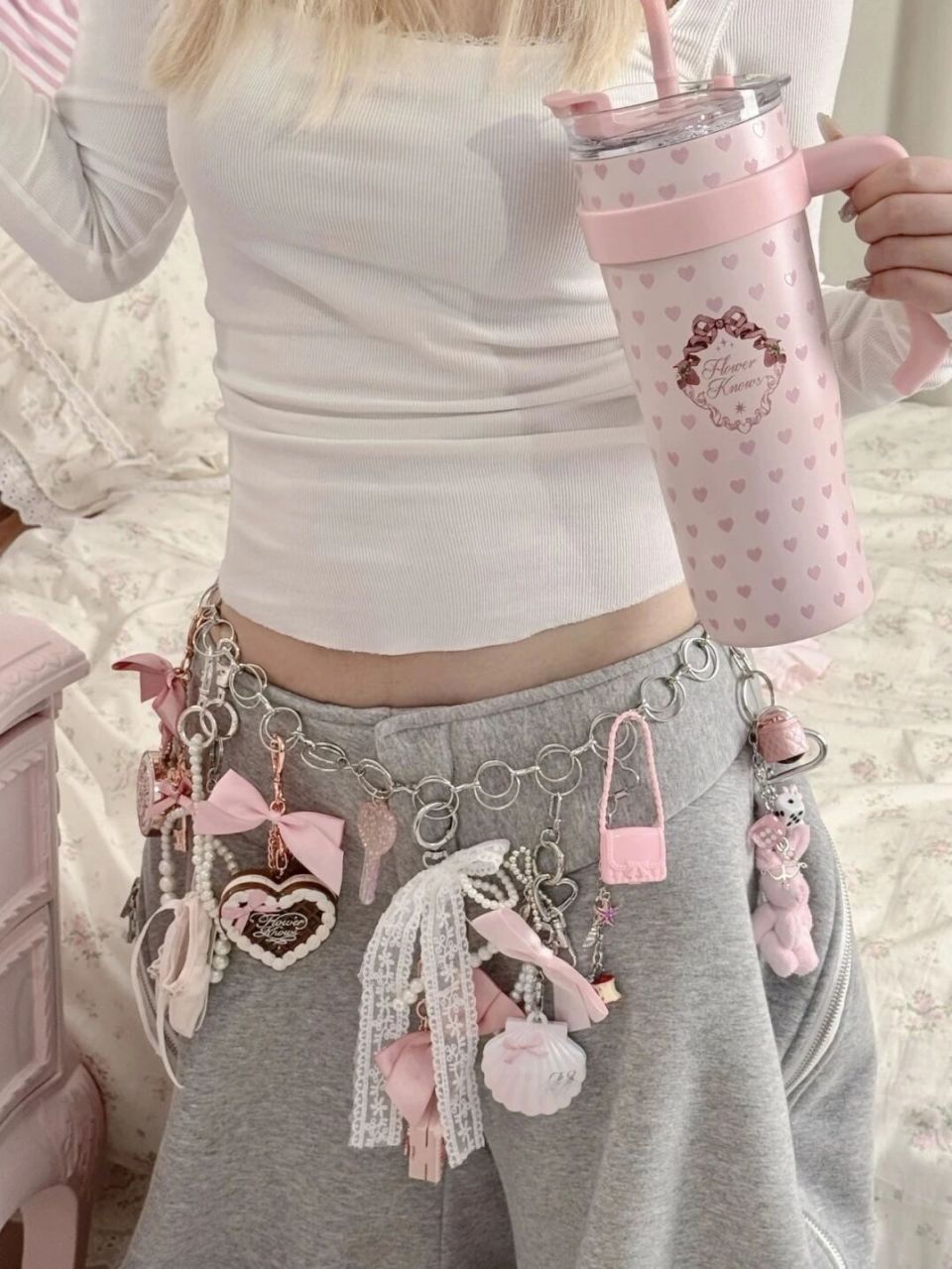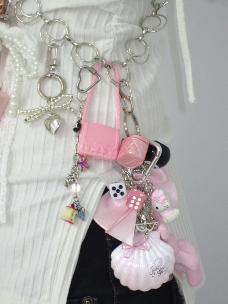 在所有美妆包挂品类里,唇釉尺寸够小,颜色够多,管身的形状和材质本身就有装饰感。牛仔裤腰间是最常见的落点,一枚糖果色管身垂在胯侧,走路时微微晃动,整身基础款瞬间多了一个视觉落点。