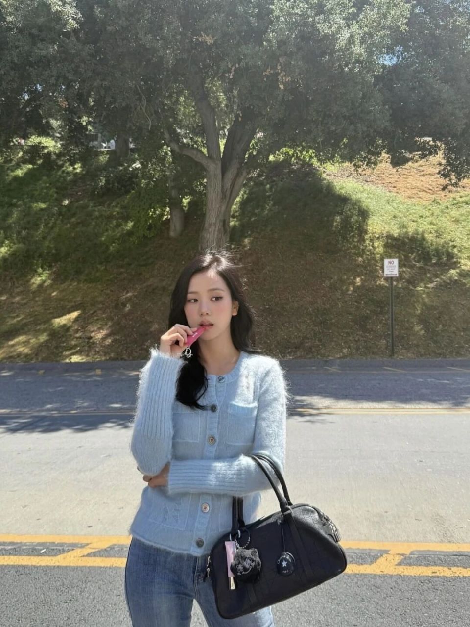 作为Dior的全球品牌大使,Jisoo多次拍摄露出的Dior粉漾果冻唇蜜,管身设计垂下来的Oblique缇花Logo吊饰,挂上去之后成了包袋装饰的一部分,可以成为整身穿搭的一部分。