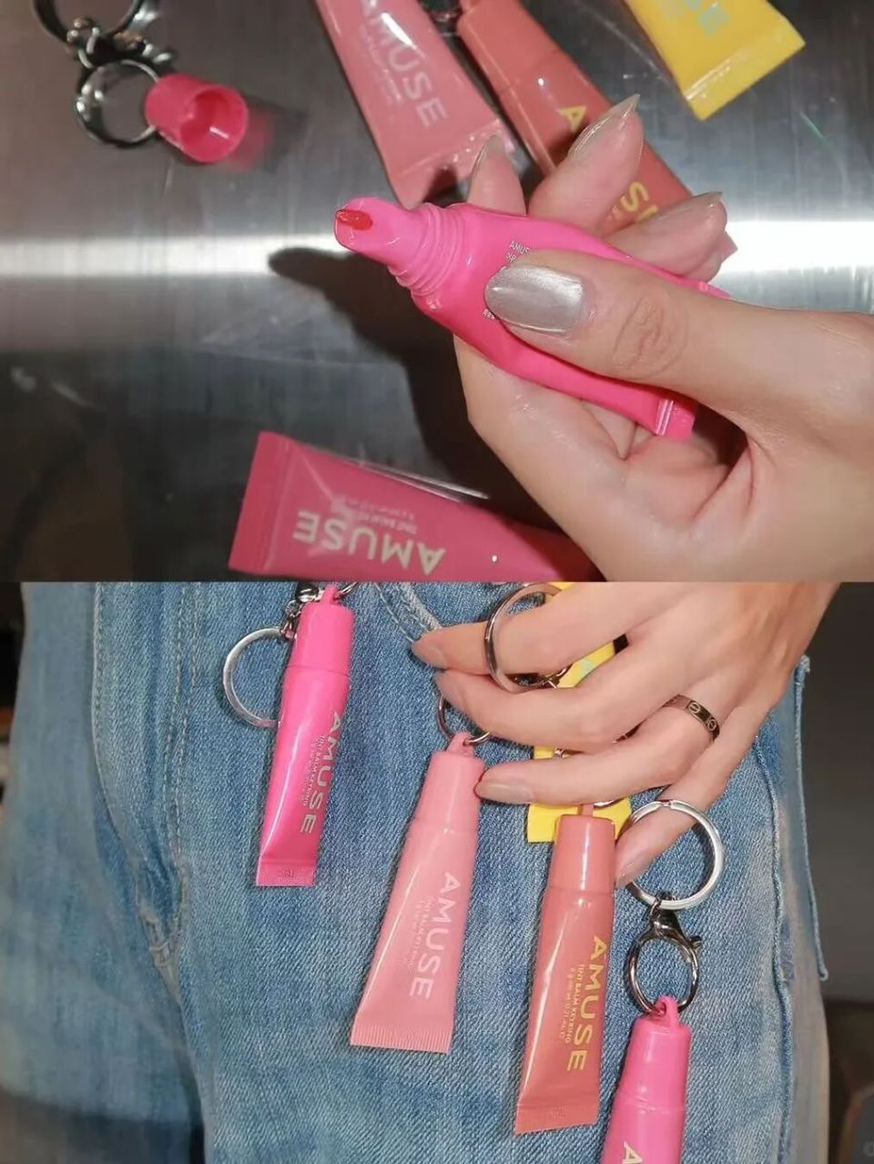 韩国品牌对“可爱”的理解向来领先。Amuse则把这种思路嵌入了产品设计的源头。张元英代言系列的唇釉,管盖顶部直接预留了挂扣结构,半透明的果冻色外壳在光线下半透不透,挂在深色包袋上是天然的撞色点缀,扣在牛仔裤腰间则多了一层随性的少女气息。博主已经将它用得出神入化——那种“我好像没怎么打扮但就是很好看”的松弛感,恰恰是韩系美学的核心配方。